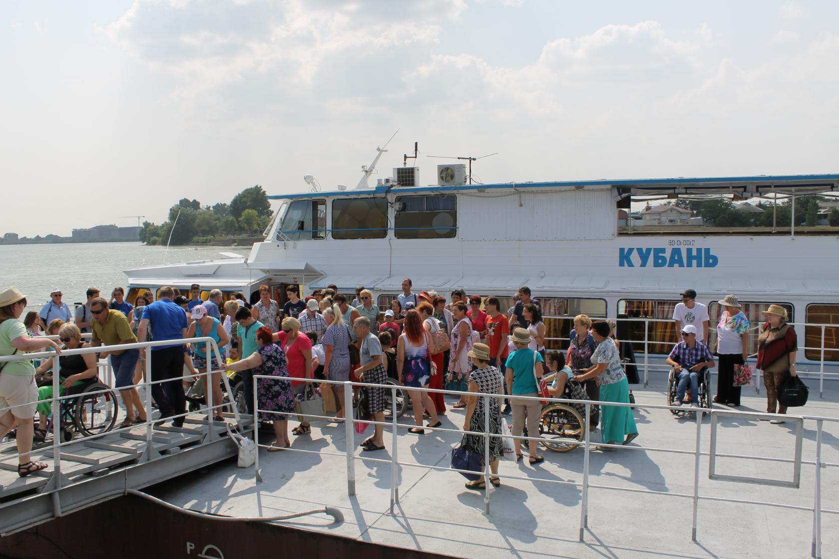 Все удобно устроились на двух палубах теплохода и отправились в путь, наблюдая пейзажи по разным берегам Кубани. Экскурсионная программа велась по радио, прерываясь на короткое время приятной музыкой.