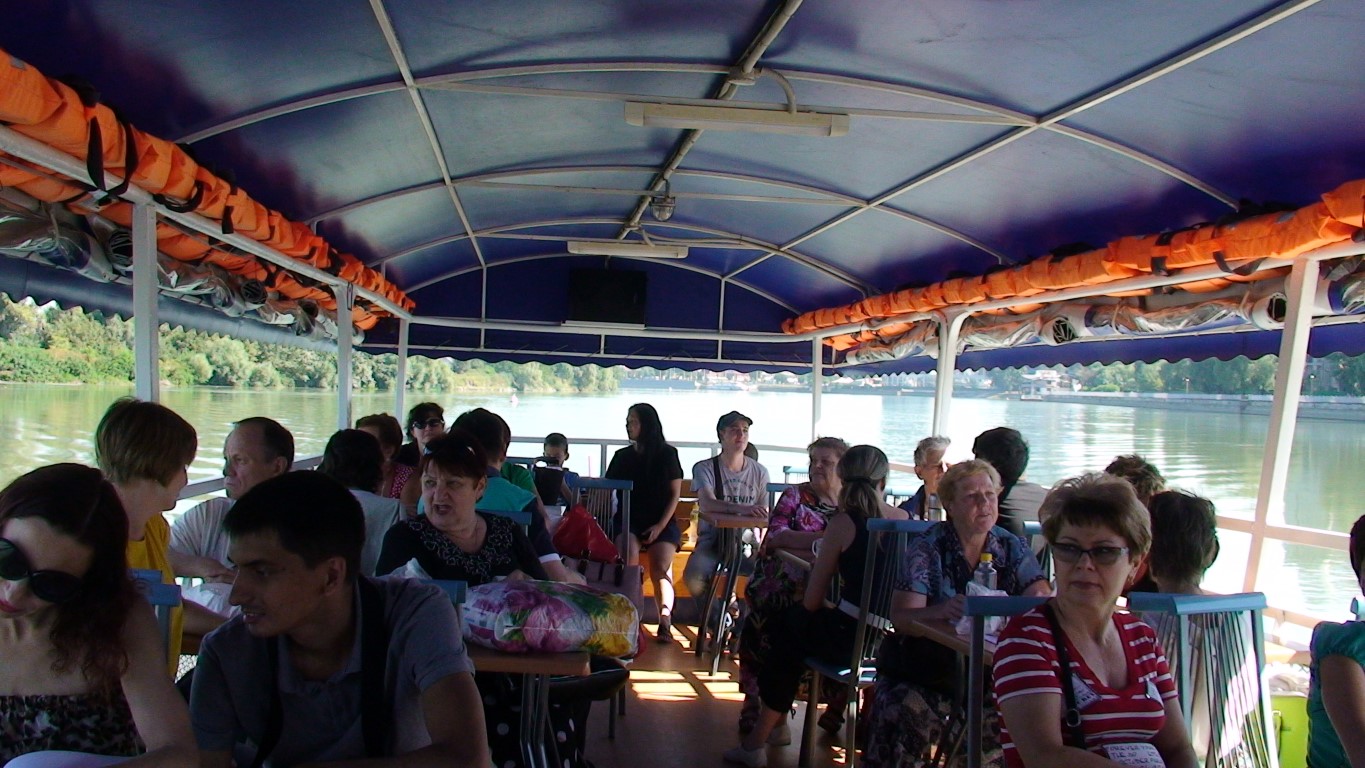 А после информационного блока был обмен мнениями, участники в теплой непринужденной обстановке общались друг с другом, любовались прекрасным пейзажем. Погода в этот день порадовала — был нежаркий, но солнечный день, а приятный ветерок на борту теплохода создавал ощущение прохлады. Два часа пролетели незаметно, и экскурсия подошла к концу.