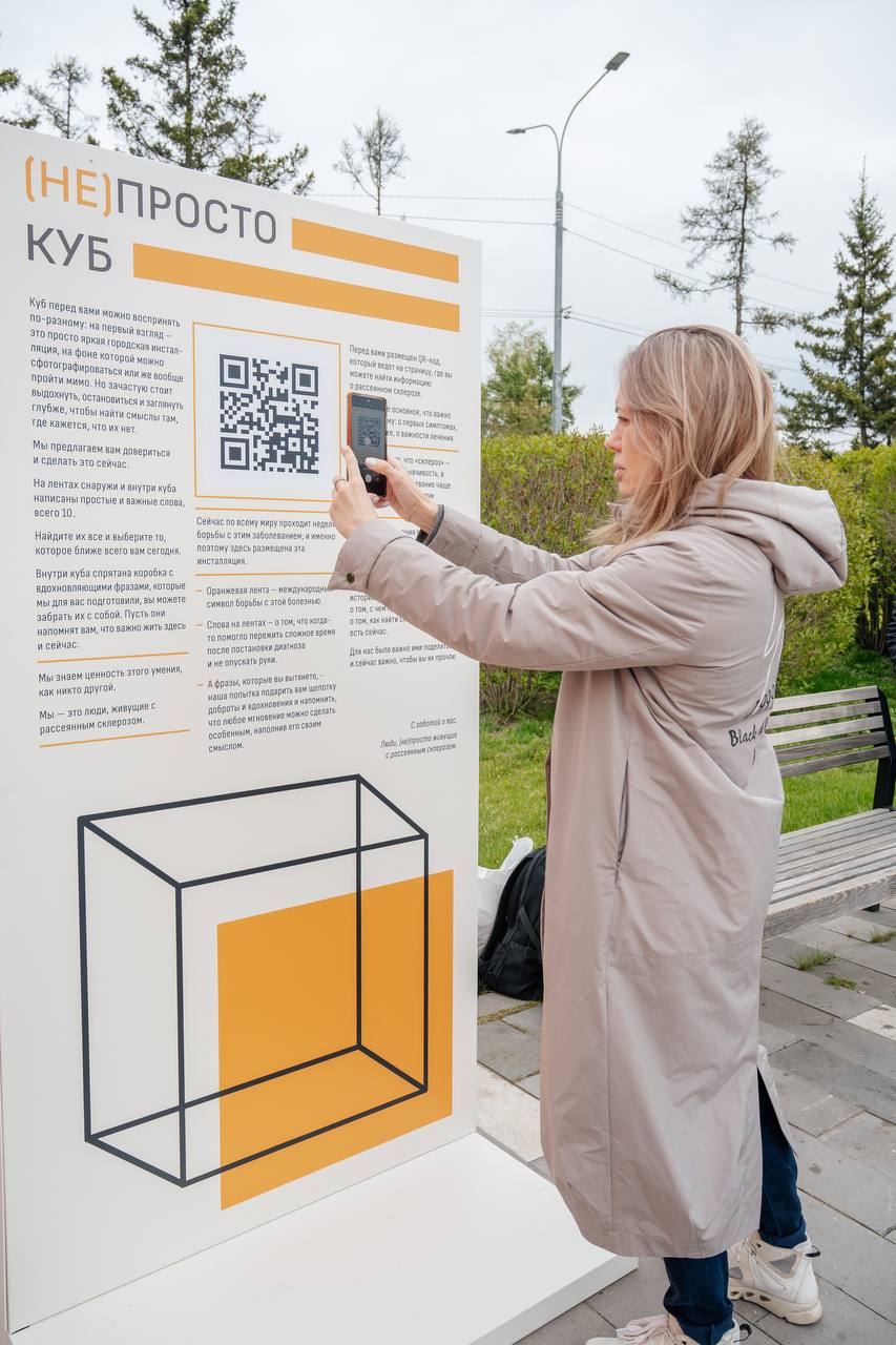 В рамках инициативы на набережной Красноярска был установлен (не)просто куб — трехметровая интерактивная арт-инсталляция с лентами оранжевого цвета — символом борьбы с рассеянным склерозом. На лентах внутри и снаружи куба были написаны слова, которые когда-то помогли людям пережить период постановки диагноза, обрести новые смыслы в жизни и узнать больше о том, что важно им и их близким. У посетителей была возможность зайти внутрь, сфотографироваться среди лент и узнать больше о рассеянном склерозе и его первых симптомах через личные истории людей, которым пришлось столкнуться с этим заболеванием. В них рассказывается о том, как это было, о том, с чем пришлось столкнуться, о том, как найти смыслы, о том, как есть сейчас. Прочесть их все еще можно на странице акции.