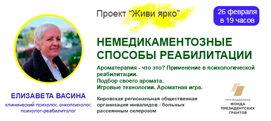 Психологический онлайн тренинг проводится в рамках реализации проекта «Живи ярко: комплексная реабилитация больных рассеянным склерозом», реализуемого Кировской региональной общественной организацией инвалидов – больных рассеянным склерозом на средства гранта, предоставленные Фондом президентских грантов.