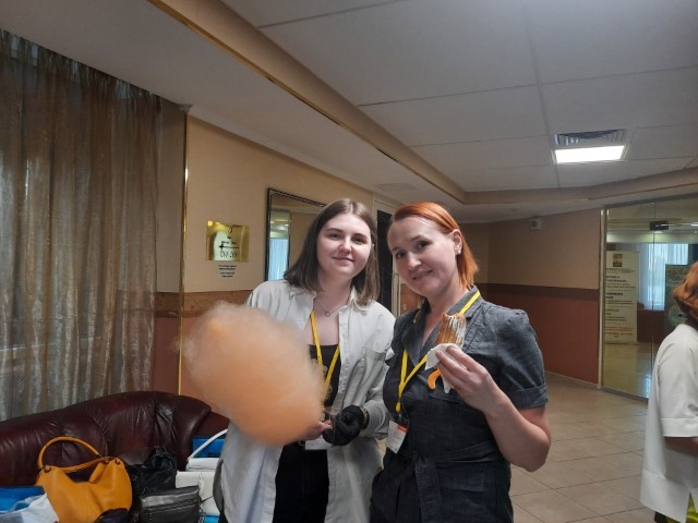 И сладкая вишенка на торте - тающий во рту, яркий подарок от волонтёра Егора. Это наслаждение детства и настроения - сладкая вата! А еще кофе-пауза от МОО «Дорога к жизни», брошюры от общероссийской общественной организации инвалидов-больных рассеянным склерозом, теплое общение и фото.