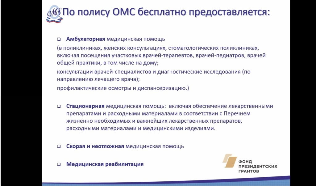 На вебинаре была дана информация, что такое - обязательное медицинское страхование. Что оно дает. Были рассмотрены принципы работы страховых представителей всех 3 уровней. Также разобрали ситуации, когда необходимо обращаться к страховым представителям.