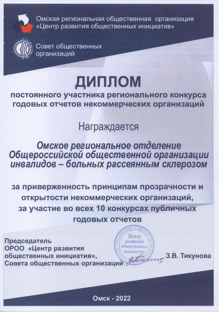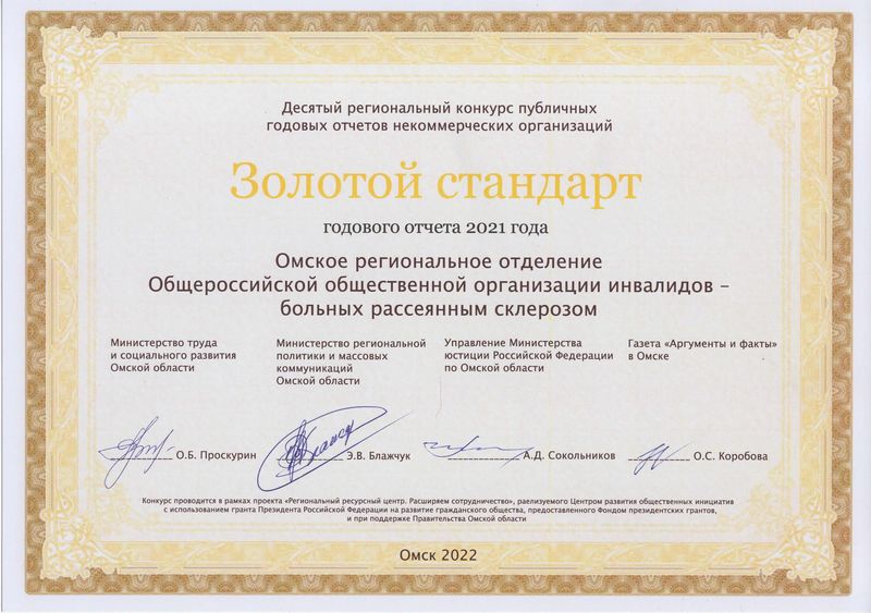 Омское региональное отделение Общероссийской общественной организации инвалидов - больных рассеянным склерозом получило Золотой стандарт и Диплом!