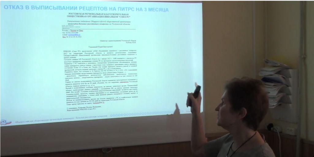 Третьим вопросом обсуждали общие проблемы пациентов с РС в Ростовской области: маршрутизация при РС, предельные сроки ожидания бесплатной медицинской помощи по ОМС согласно Программе госгарантий бесплатного оказания гражданам медицинской помощи 2022, выписку рецептов на 3 месяца, прохождение комиссии для выписки рецептов и т.д.