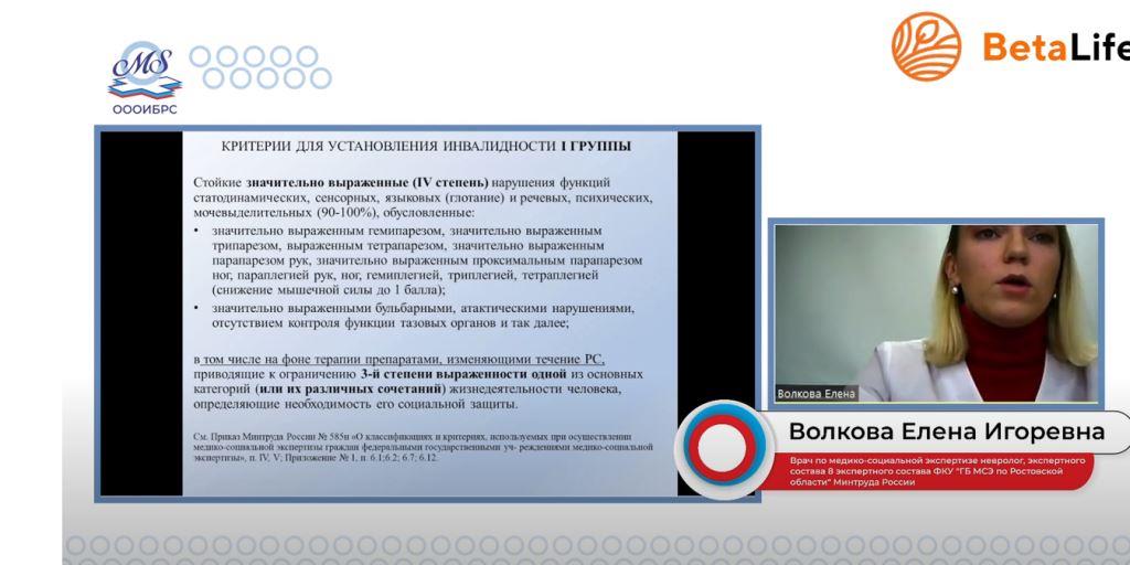 Волкова Е.И., врач МСЭ, в онлайн выступлении постаралась разъяснить вопросы признания лица инвалидом при РС, рассмотрела зависимость группы инвалидности от наличия нарушений функций организма. Доктор рекомендовала очень тщательно отнестись к сбору документов для освидетельствования, и советовала в первый раз прийти на комиссию все-таки очно.