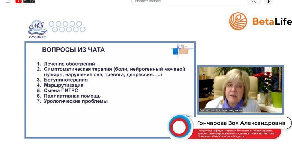 Гончарова З.А. рассказала о современных подходах к лечению РС, о сложности алгоритмов выбора врачом препарата ПИТРС для каждого пациента, о критериях замены ПИТРС, ответила на вопросы о симптоматическом лечении, о перспективах развития семейных случаев РС и др.