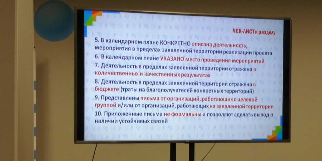 Участники занятия посмотрели на свои заявки глазами экспертов, отметили аспекты, требующие доработки. Уяснили полезные советы экспертов по каждому из 4 разобранных критериев.