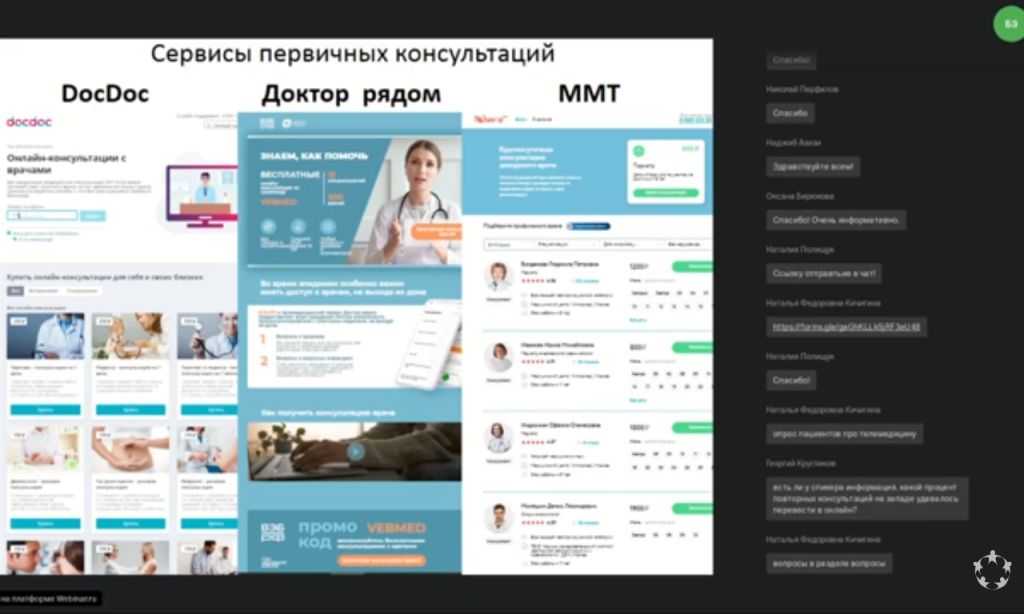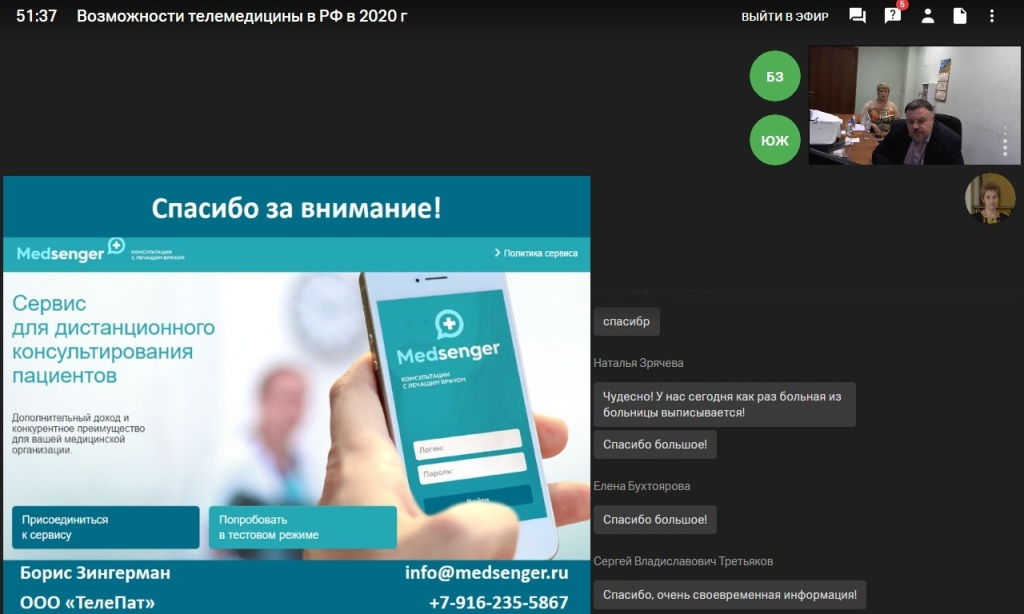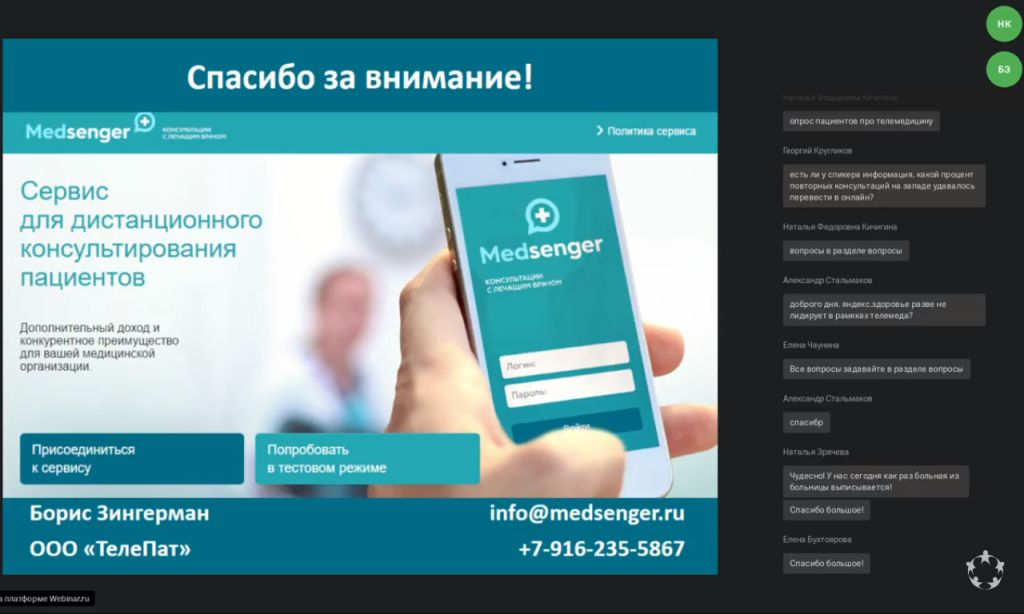 В заключении лекторы и сопредседатели ВСП, Власов Я.В. и Жулев Ю.А. ответили на вопросы участников и выразили надежду, что телемедицинские сервисы в будущем войдут в систему ОМС и станут удобным инструментом медицинской помощи.