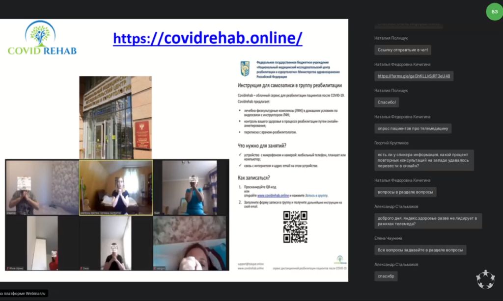Недавно совместно с ФГБУ «Национальный медицинский исследовательский центр реабилитации и курортологии при МЗРФ» был создан телемедицинский ресурс https://covidrehab.online/ для реабилитации пациентов после Ковид 19.