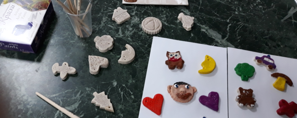 В ходе занятий реабилитанты знакомятся с техникой выполнения работ из теста, лепкой, бумажная пластикой, вязанием, вышивка.