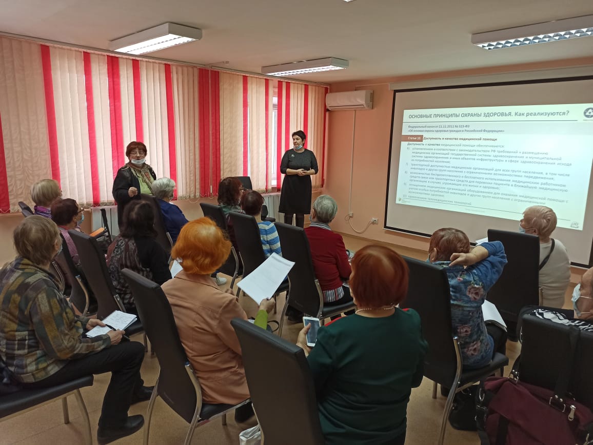 Слушателями были заданы и обсуждены вопросы сроков и качества оказания медицинской помощи, записи к врачам-терапевтам и узким специалистам, запроса в лечебном учреждении информации о состоянии своего здоровья. В завершение встречи Елена Романюк дала информацию о телефоне горячей линии Всероссийского союза пациентов, показала, как пользоваться сайтом «Навигатор пациентов» и раздала календари с контактной информацией.