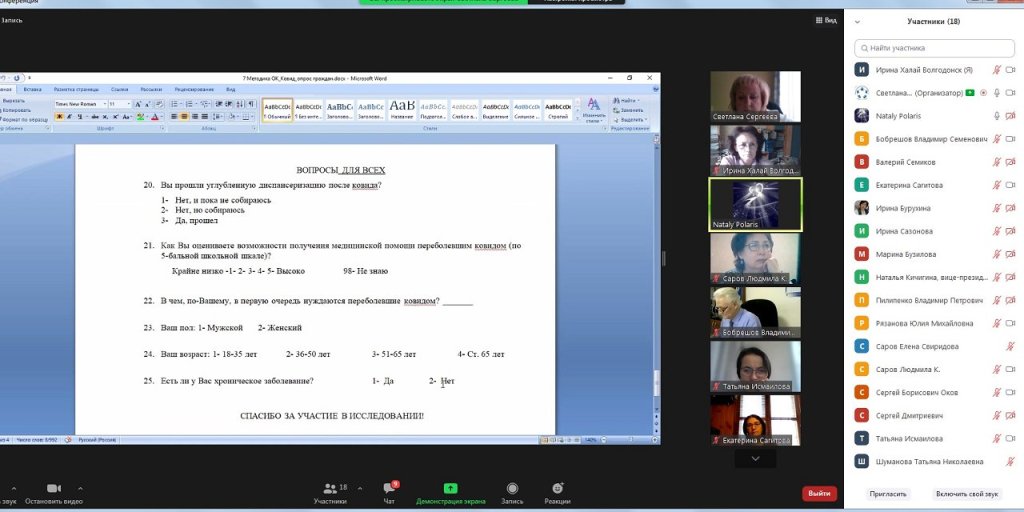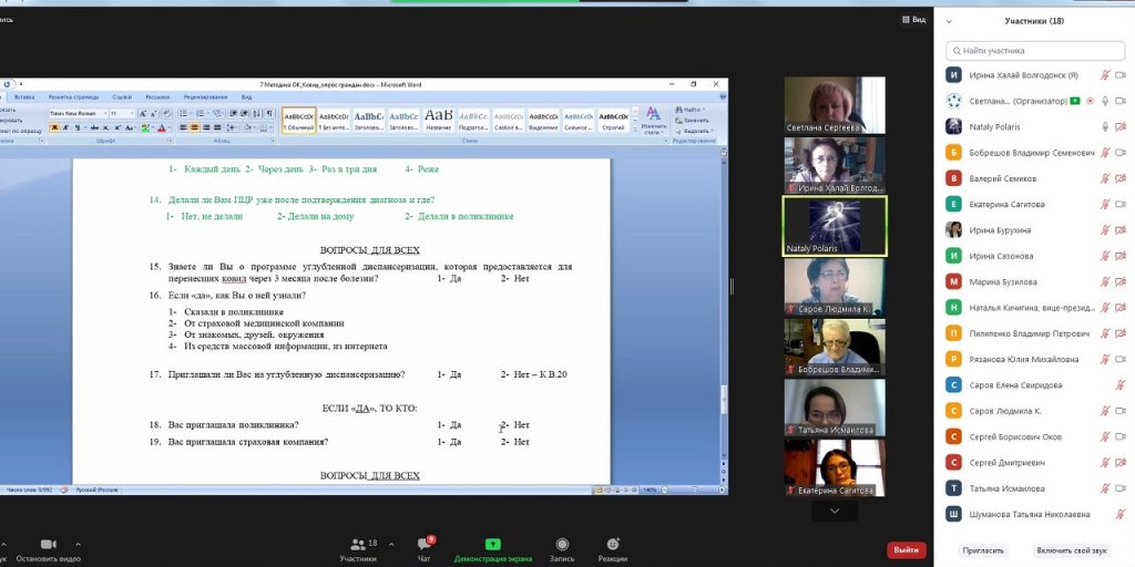 Вторым вопросом совещания было обсуждение проведения анкетирования жителей городов участников проекта «Ковид-19: лекарства и диспансеризация», с целью проведения анализа ситуации перенесения Covid в амбулаторных условиях, обеспечение лекарствами, поддержание связей с поликлиникой, описания ситуации вокруг углубленной диспансеризацией и другие вопросы. Вопросы очень актуальные в настоящее время и не потеряют своей значимости в ближайший год.
