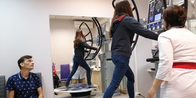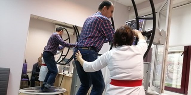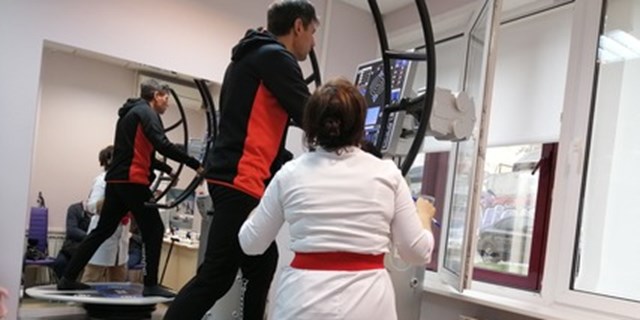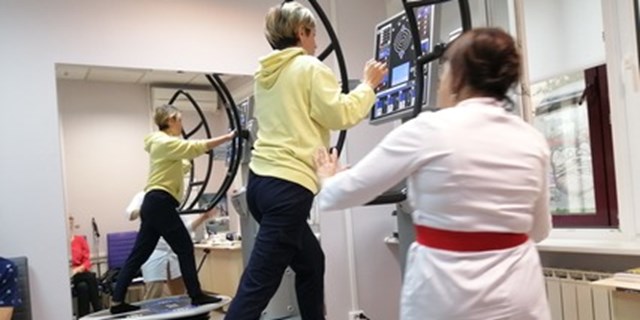 Реабилитанты медленно взбирались на нестабильную платформу аппарата, держались за динамическую рукоять, смотрели на сенсорный экран, чтобы отследить свои результаты и выполняли упражнения. Задача при выполнении упражнений -удержать равновесие и одновременно выполнять упражнения руками (толкать или тянуть рукоять)с одинаковой силой справа и слева. На экране выводятся результаты в цифрах. Занятие проходило под контролем врача ЛФК.