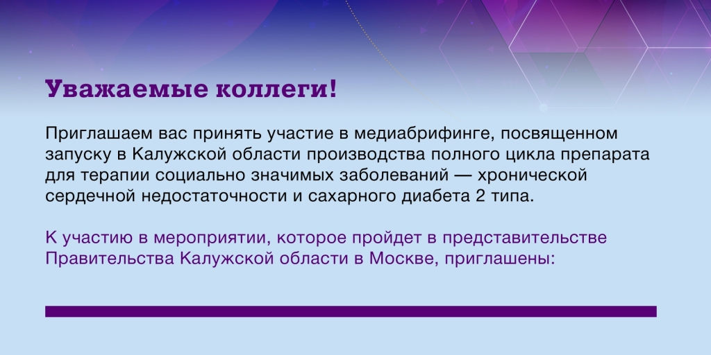 Добрый день! Приглашаем принять участие в онлайн-медиа брифинге, посвященном запуску в Калужской области производства полного цикла препарата для терапии социально значимых заболеваний – хронической сердечной недостаточности и сахарного диабета 2 типа.