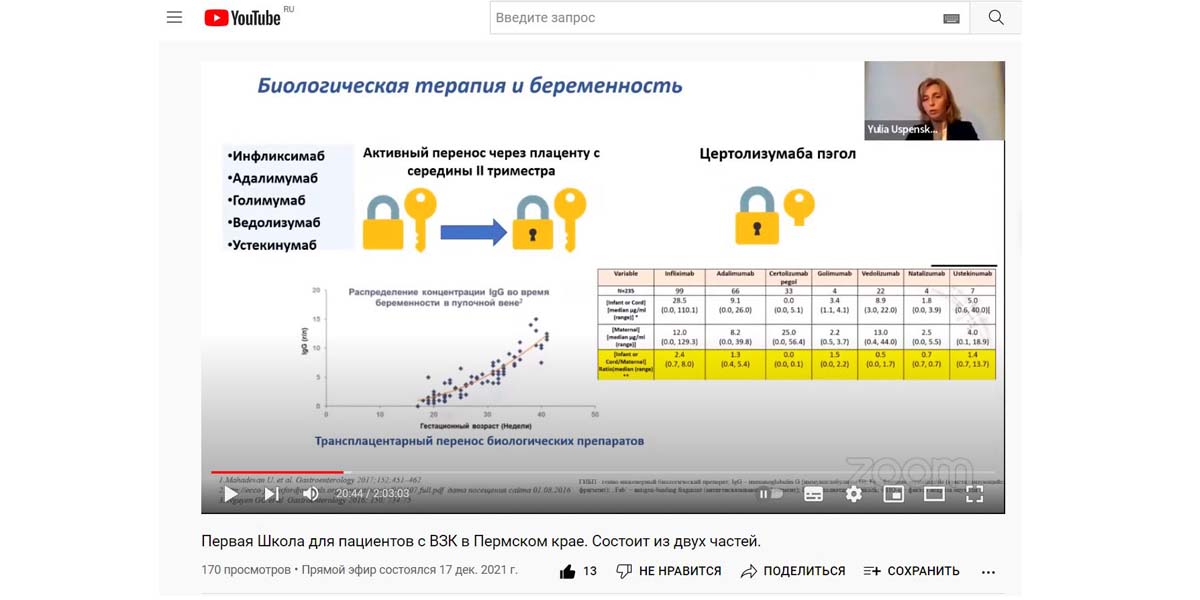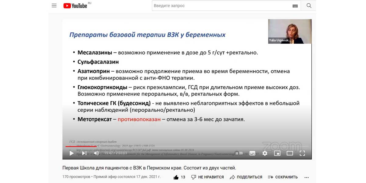 Успенская Юлия Борисовна, доктор медицинских наук, врач-гастроэнтеролог, основным направлением деятельности которой является сочетанная патология органов пищеварения и репродуктивной системы у женщин, в т.ч. во время беременности. Доктор осветила волнующую тему «Воспалительные заболевания кишечника и беременность». Ответила на многочисленные вопросы слушателей.