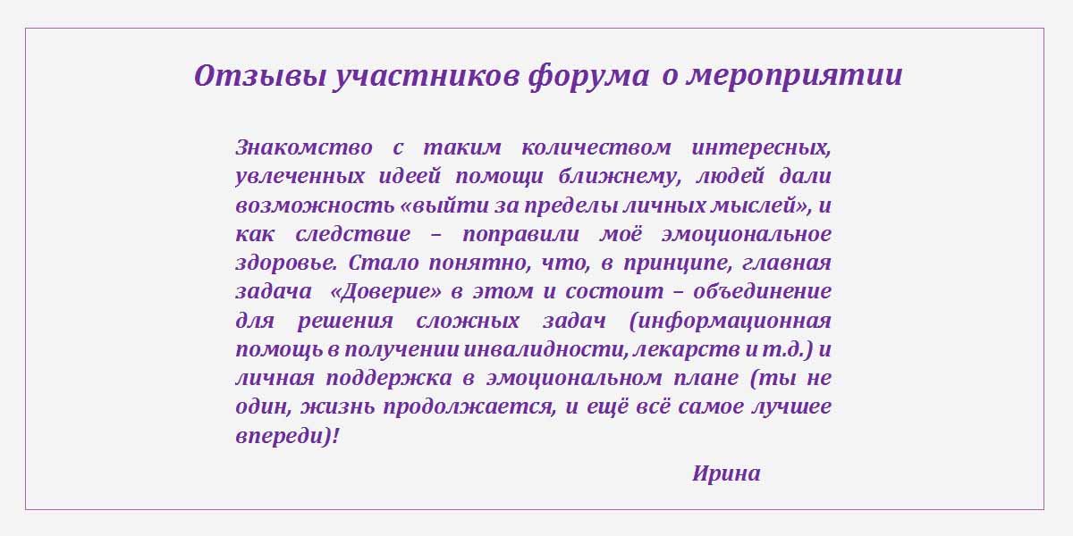 10 лет деятельности - много это или мало? Цифры скажут сами за себя. МОО «Доверие» сегодня имеет 47 региональных отделений от Якутска до Калининграда. За эти годы реализовано 55 проектов, из которых 3 проекта при поддержке Фонда президентских грантов, проведено 42 школы для пациентов в разных регионах России. Организация является членом Всероссийского союза пациентов, участником общественных советов при Минздраве России, Росздравнадзоре, членом EFCCA (Европейской федерации ассоциаций по болезни Крона и язвенному колиту), имеет партнеров среди НКО и учреждений здравоохранения. Принимает участие в заседаниях, совещаниях, круглых столах, общественных советах от регионального уровня до федерального, выдвигает инициативы и находит поддержку, и все это приносит свои результаты.