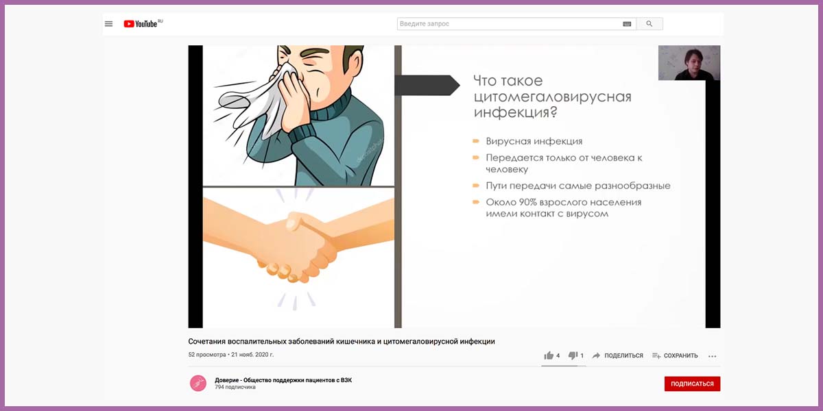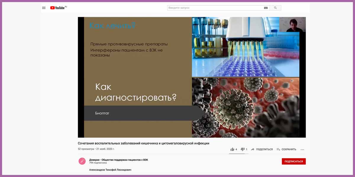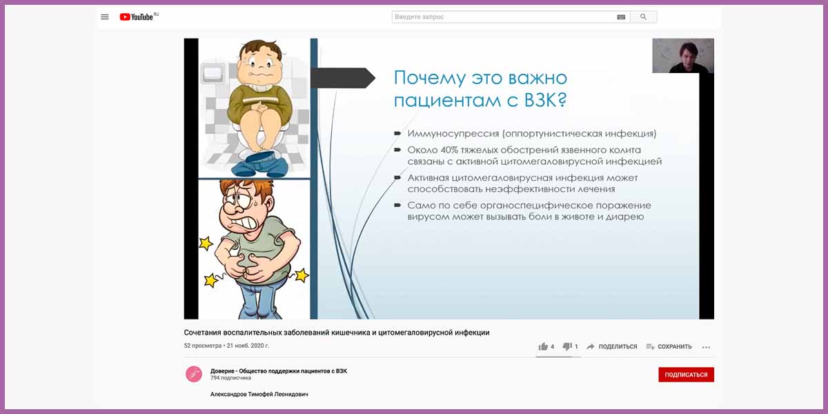 Т. Л. Александров, младший научный сотрудник отдела по изучению функциональных и воспалительных заболеваний кишечника ФГБУ «НМИЦ колопроктологии имени А.Н. Рыжих», затронул интересную и важную для пациентов с ВЗК тему цитомегаловирусной инфекции. https://www.youtube.com/watch?v=Zm87OszQr5I
