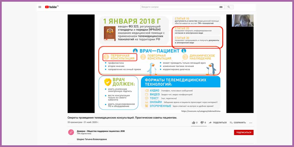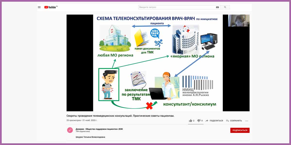 Т. В. Шкурко, заведующая оргметодотделом по колопроктологии ГБУ «НИИОЗММ Департамента здравоохранения г. Москвы», вед. науч. сотр. отдела организационно-методического управления и анализа качества медицинской помощи по профилю «колопроктология» ФГБУ «НМИЦ колопроктологии имени А.Н. Рыжих», к.м.н, подробно остановилась на теме телемедицинских консультаций и дала практические советы пациентам. https://www.youtube.com/watch?v=XJb4CVoxhDk