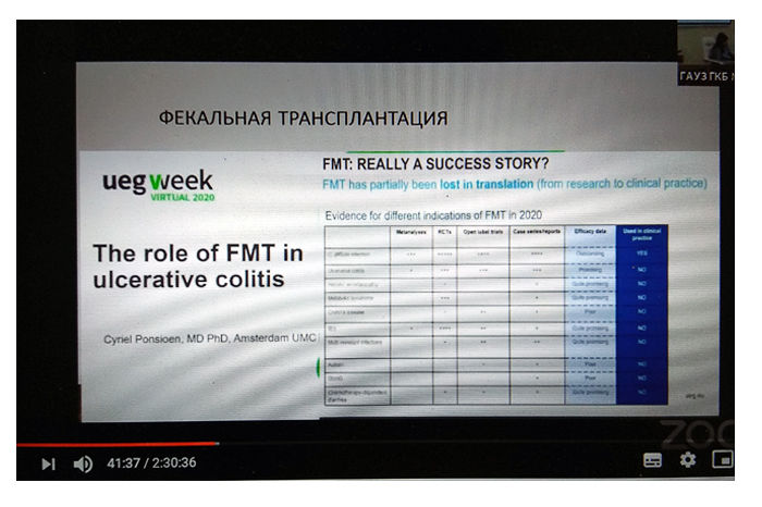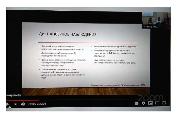 Исхакова Диляра Габдрашидовна, врач-гастроэнтеролог высшей категории, руководитель Городского Центра диагностики и лечения ВЗК, г. Казань; заведующая отделением гастроэнтерологии ГАУЗ «ГКБ № 7». Диляра Габдрашидовна широко осветила методы лечения болезни Крона и язвенного колита. Также для пациентов города Казани была подробно описана маршрутизация, дана полная информация о Центре ВЗК Городской клинической больницы №7. По многочисленным просьбам изложена актуальная информация о лечении ОРВИ, COVID-19 при ВЗК.
