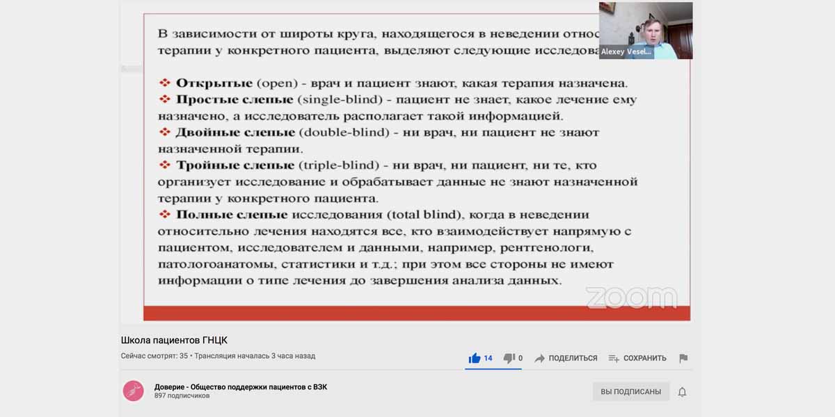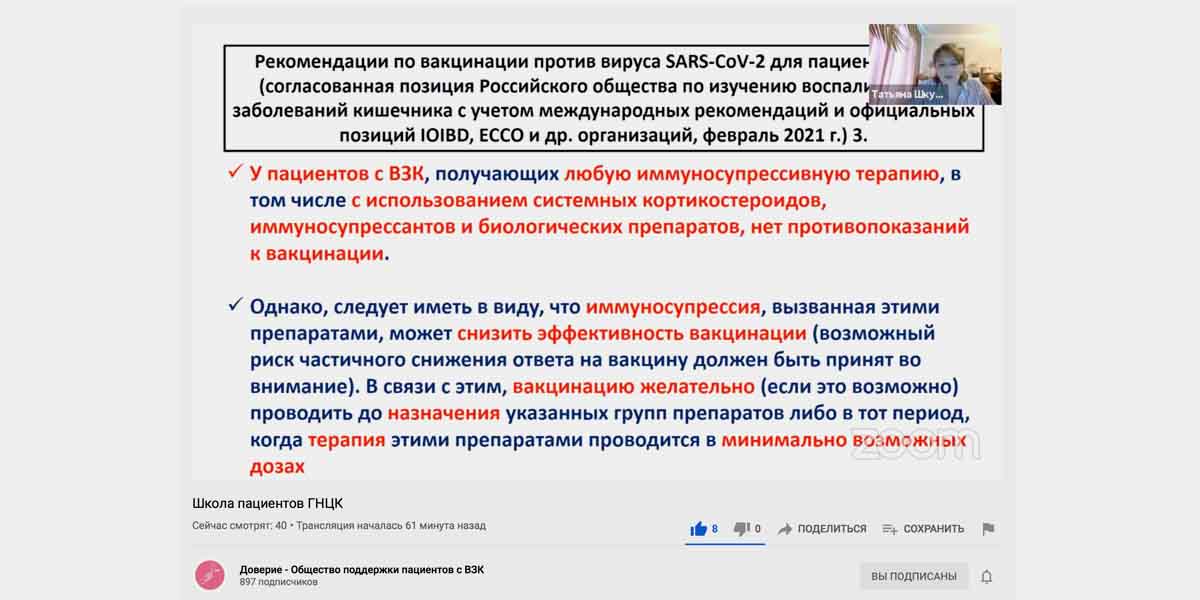 27 февраля 2021 года прошла традиционная Школа пациентов с ВЗК, которую провели специалисты ведущего профильного федерального учреждения «НМИЦ колопроктологии имени А.Н. Рыжих» Минздрава России. Мероприятие прошло в онлайн-формате, что позволило принять участие пациентам из разных уголков России.