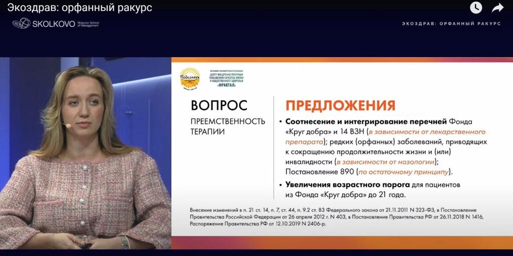 В начале дискуссии Ирина Бакрадзе, президент фонда «ПОДСОЛНУХ», член Экспертного Совета по редким заболеваниям при Комитете по охране здоровья ГД РФ напомнила, из чего складывается благополучный статус пациента: « Это осведомленность общества о проблеме орфанных болезней, семейное генетическое консультирование, своевременная диагностика, социализация и психологическая поддержка пациентов. Но все эти составляющие не будут работать без базовой - непрерывной и эффективной терапии».