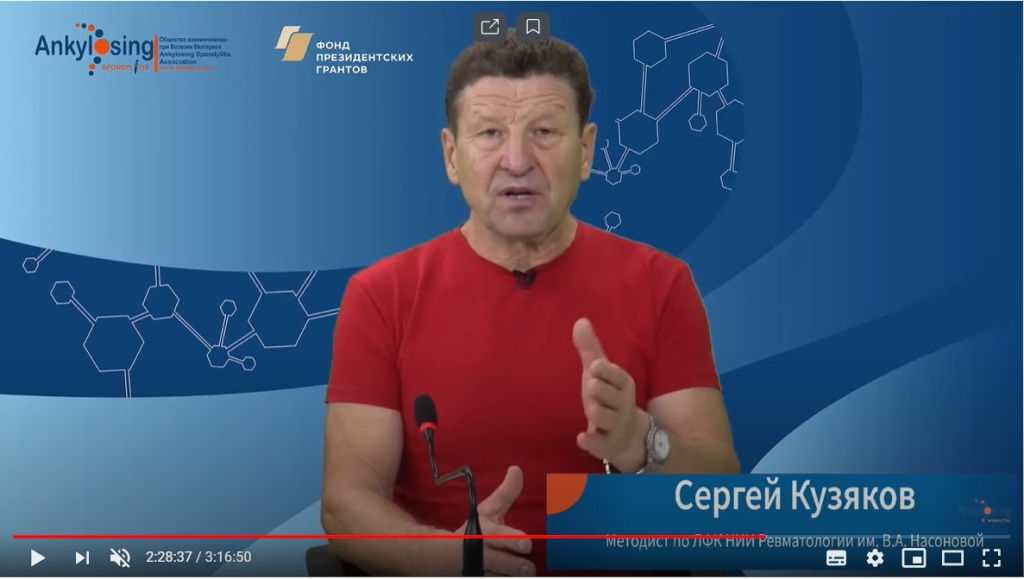 После сессии ответов на вопросы участников Сергей Кузяков, ведущий методист НИИ ревматологии им. В.А. Насоновой, провел в прямом эфире практические занятия по специальному курсу ЛФК. Сергей Николаевич показал и выполнил вместе с пациентами разработанный им для ревматологических пациентов комплекс упражнений.